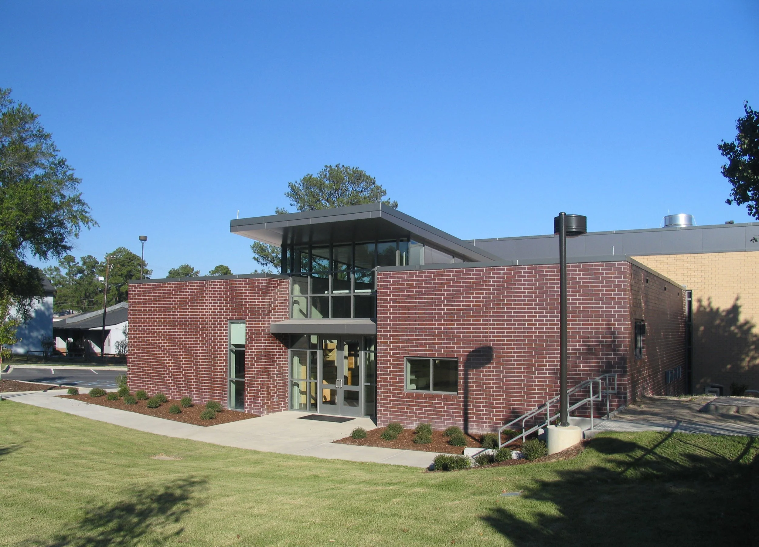Following a significant transformation in curriculum and focus for the former "Tool and Die" program, this Precision Machining facility on the Beltline campus of Midlands Technical College makes a significant statement about the College's commitment to recreating a high-tech professional shop environment with state-of-the-art infrastructure. Along with the Student Services Addition constructed concurrently, this shop/classroom building plan creates an edge to a new student centered courtyard on the northern boundary of the campus, thereby transforming that often neglected "back door" face of campus. The building is organized into two interlocking masses, one housing the shop and shop support spaces, and the other classrooms and admin support. The shop is designed to offer flexibility of use and equipment arrangements, and is bathed in natural light provided by clerestory windows located above, freeing up valuable wall space for equipment.